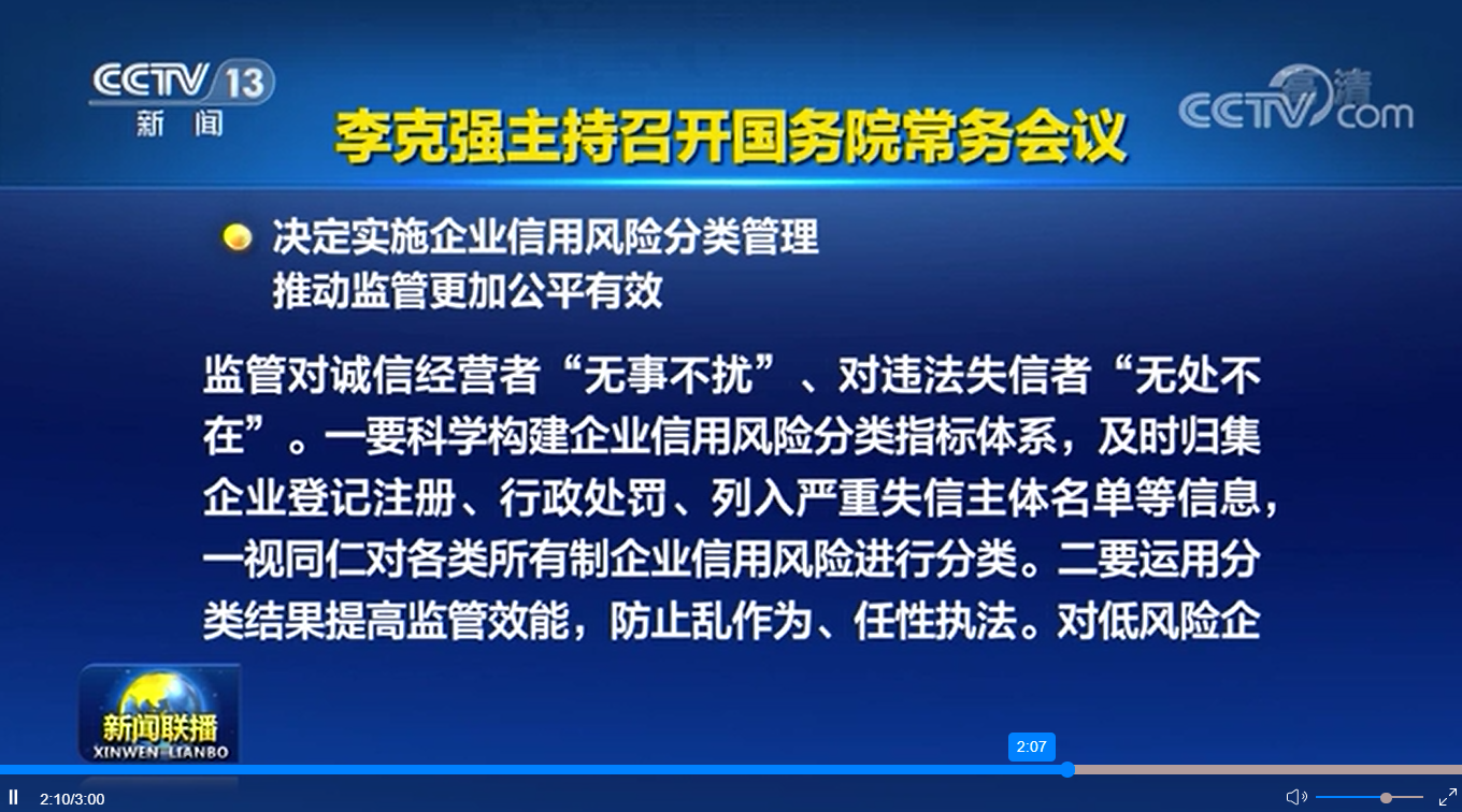 會議指出,信用是市場經濟的基礎。為營造誠實守信、公平競爭市場環(huán)境,要依法依規(guī)推進企業(yè)信用風險分類管理,相應采取“雙隨機、一公開”等科學精準的監(jiān)管措施,使監(jiān)管對誠信經營者“無事不擾”、對違法失信者“無處不在”。