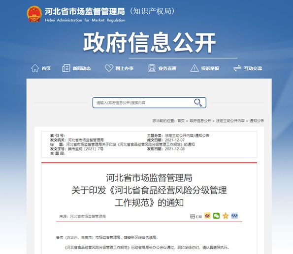 據(jù)河北省市場(chǎng)監(jiān)督管理局消息,為強(qiáng)化食品經(jīng)營風(fēng)險(xiǎn)管理,科學(xué)有效實(shí)施監(jiān)管,切實(shí)提高食品安全監(jiān)管效能和水平,日前,河北省市場(chǎng)監(jiān)督管理局正式印發(fā) 《河北省食品經(jīng)營風(fēng)險(xiǎn)分級(jí)管理工作規(guī)范》(以下簡(jiǎn)稱《工作規(guī)范》),對(duì)食品經(jīng)營環(huán)節(jié)風(fēng)險(xiǎn)分級(jí)管理工作統(tǒng)一進(jìn)行規(guī)范。