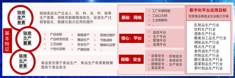 數(shù)字化食品生產(chǎn)企業(yè)界定:基于“互聯(lián)網(wǎng)+”發(fā)展概念,以云計(jì)算服務(wù)、大數(shù)據(jù)計(jì)算、5G通訊技術(shù)、區(qū)塊鏈應(yīng)用技術(shù)為代表的先進(jìn)信息技術(shù)與食品生產(chǎn)業(yè)務(wù)深度融合形成的新業(yè)務(wù)平臺(tái)和新運(yùn)營(yíng)模式,本質(zhì)是用“數(shù)據(jù)+模型”的方式方法為食品生產(chǎn)企業(yè)提供輔助業(yè)務(wù)實(shí)操的應(yīng)用服務(wù),以管理中心、生產(chǎn)制造中心、質(zhì)控保障中心、經(jīng)營(yíng)銷售中心、食品安全中心的數(shù)據(jù)互聯(lián)互通為基礎(chǔ),通過(guò)對(duì)人機(jī)料法環(huán)檢六維數(shù)據(jù)的全面量化建模、快速計(jì)算處理和實(shí)時(shí)傳輸交換,實(shí)現(xiàn)數(shù)據(jù)控制、生產(chǎn)優(yōu)化和生產(chǎn)組織方式變革的先進(jìn)數(shù)字制造型企業(yè)。